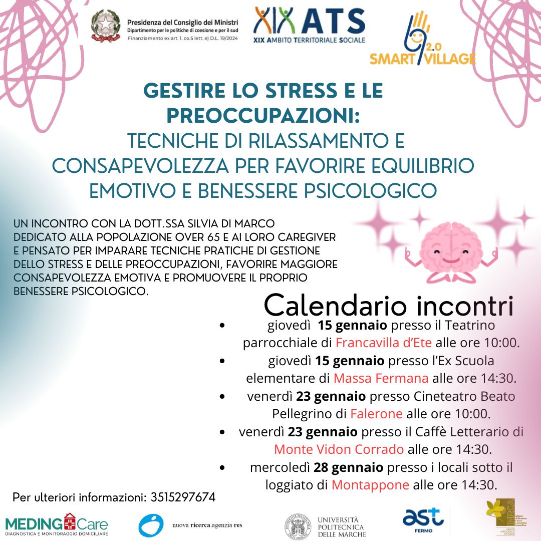 Progetto Smart Village 2.0 - Calendario degli incontri che la psicologa Dott.ssa Silvia Di Marco terrà nei Comuni sul tema "Gestirelo stress e le preoccupazioni":