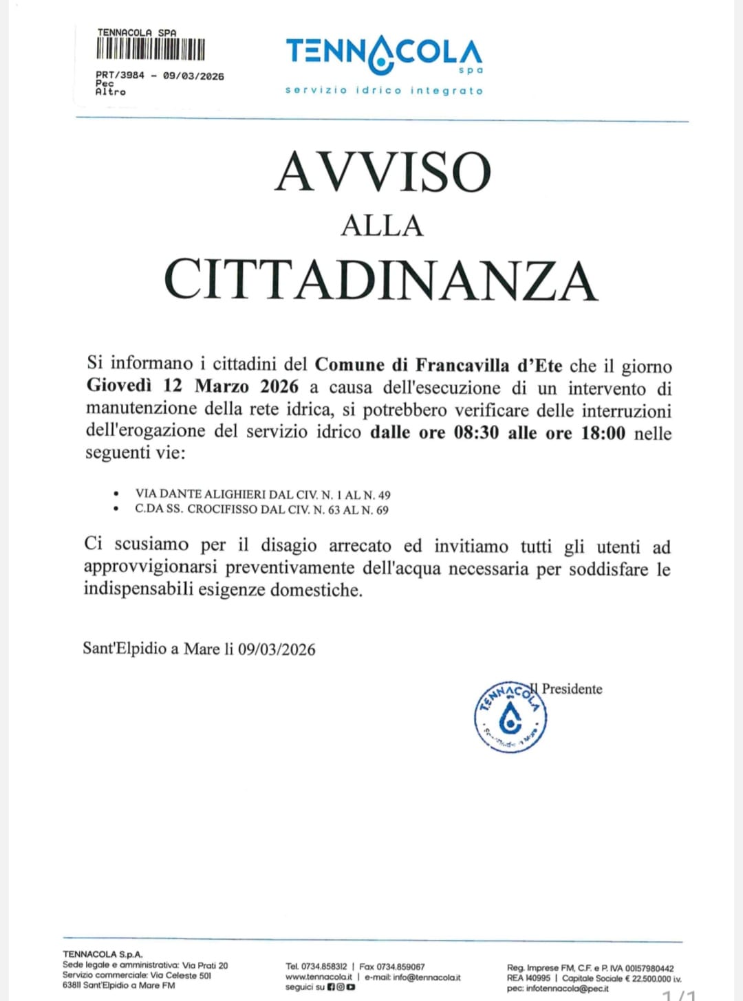 Si avvisano i cittadini del Comune di Francavilla d'Ete che il giorno giovedì 12 marzo 2026 a causa dell'esecuzione di un intervento di manutenzione della rete idrica, si potrebbero verificare delle interruzioni dell'erogazione del servizio idrico dalle ore 08:30 alle ore 18:00 nelle seguenti vie: